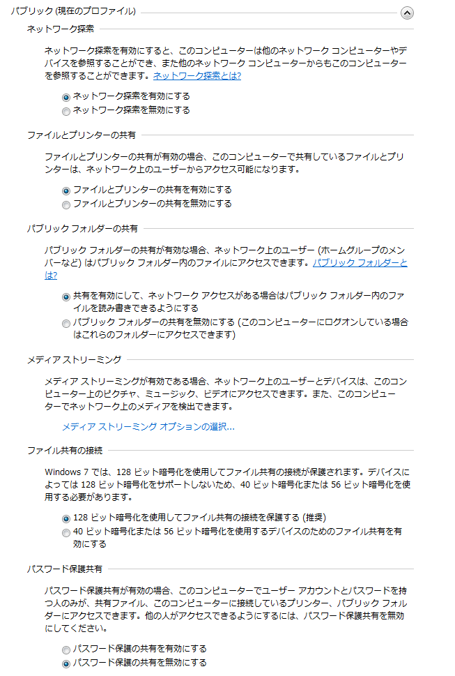 マイネットワーク→プロパティ→共有の詳細設定の変更