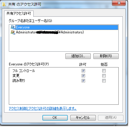 共有フォルダ→プロパティ→共有タブ→詳細な共有→アクセス許可