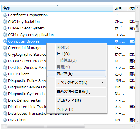 ③の「Computer Browser」サービスを再起動するか、PCを再起動します。