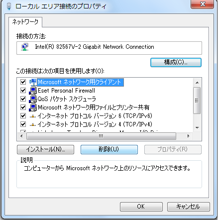 「Microsoftネットワーク用クライアント」を「削除」し、