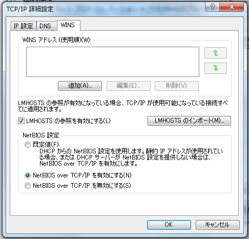 プロパティ→詳細設定→WINSタブ